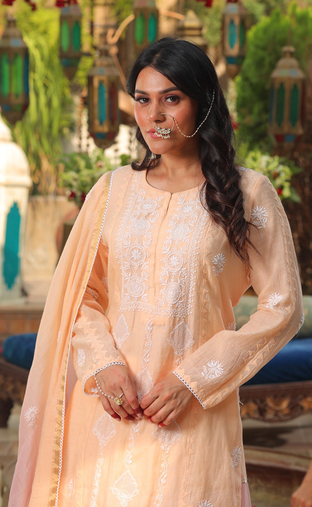 A soft celebration of tradition and femininity, this peach-pink chikankari set is crafted in airy tissue fabric, perfect for sunlit festivities. The straight peach kurta is adorned with delicate hand-embroidered chikankari, beautifully contrasted by a flared pink sharara and a sheer matching dupatta. With its gentle drape and ethereal detailing, this ensemble is made for festive mornings and intimate gatherings.