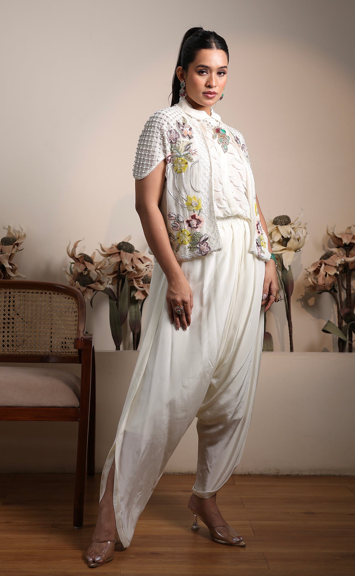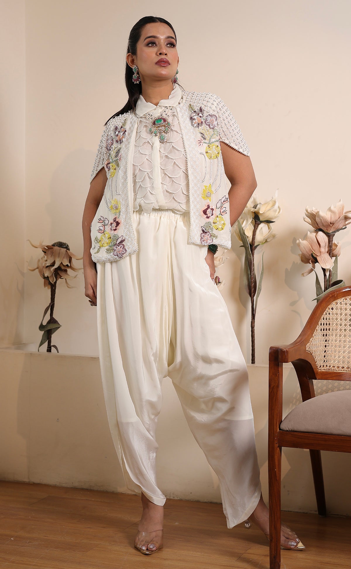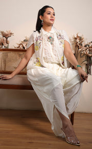 Chic, versatile, and celebration-ready — this soft white 4-piece ensemble blends modern tailoring with festive charm. The set includes a structured bustier, a crisp collared shirt, a statement embroidered jacket, and relaxed-fit bottoms, all brought to life with delicate pearl and multicolor tiki embroidery for a fresh, elevated look.