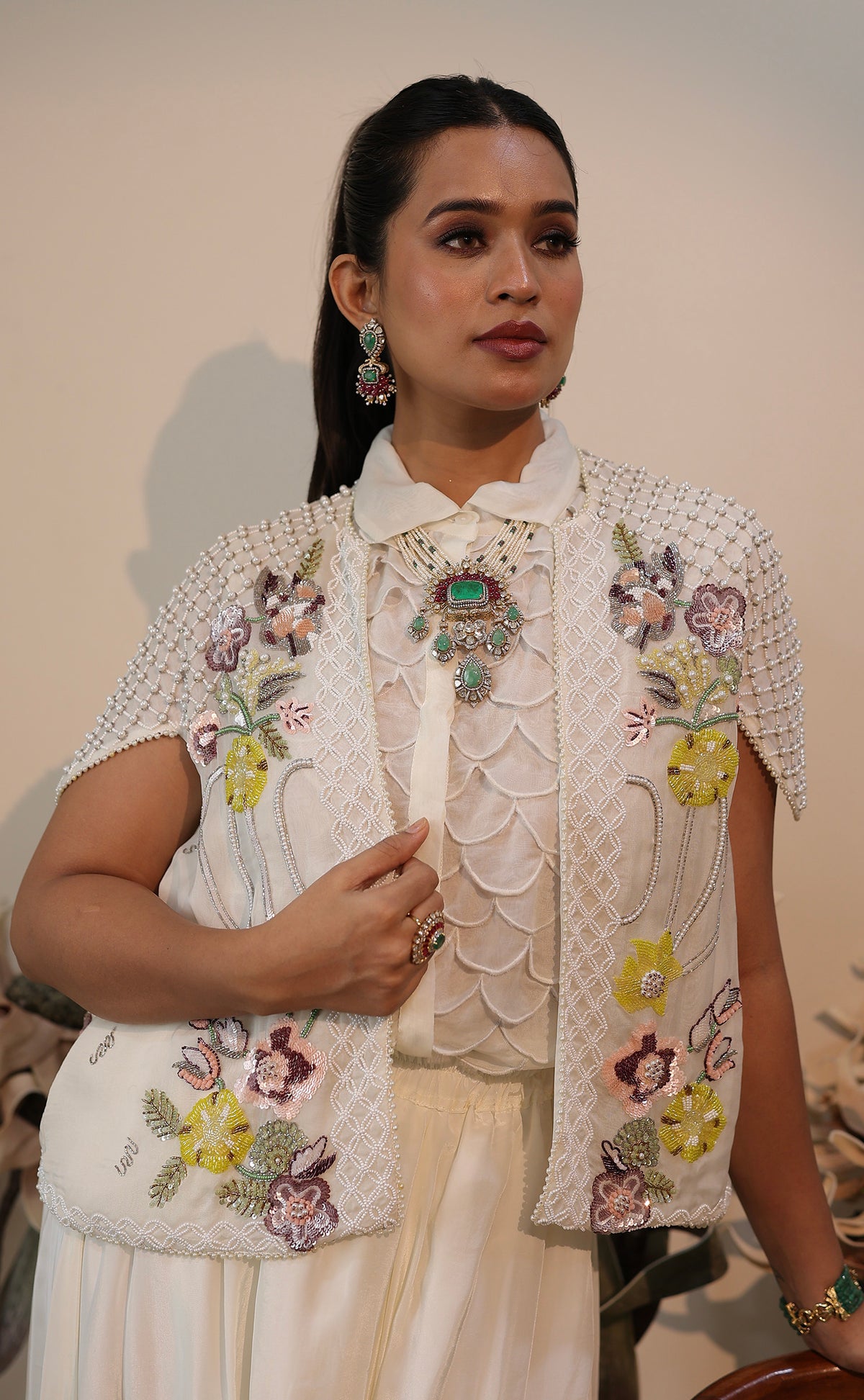 • Work: Hand embroidery featuring pearls and multicolor tiki accents