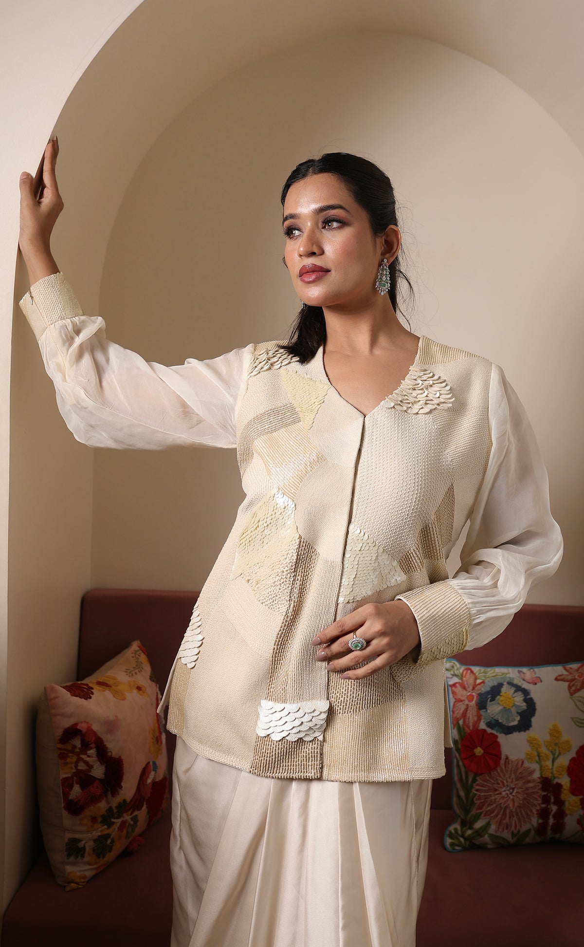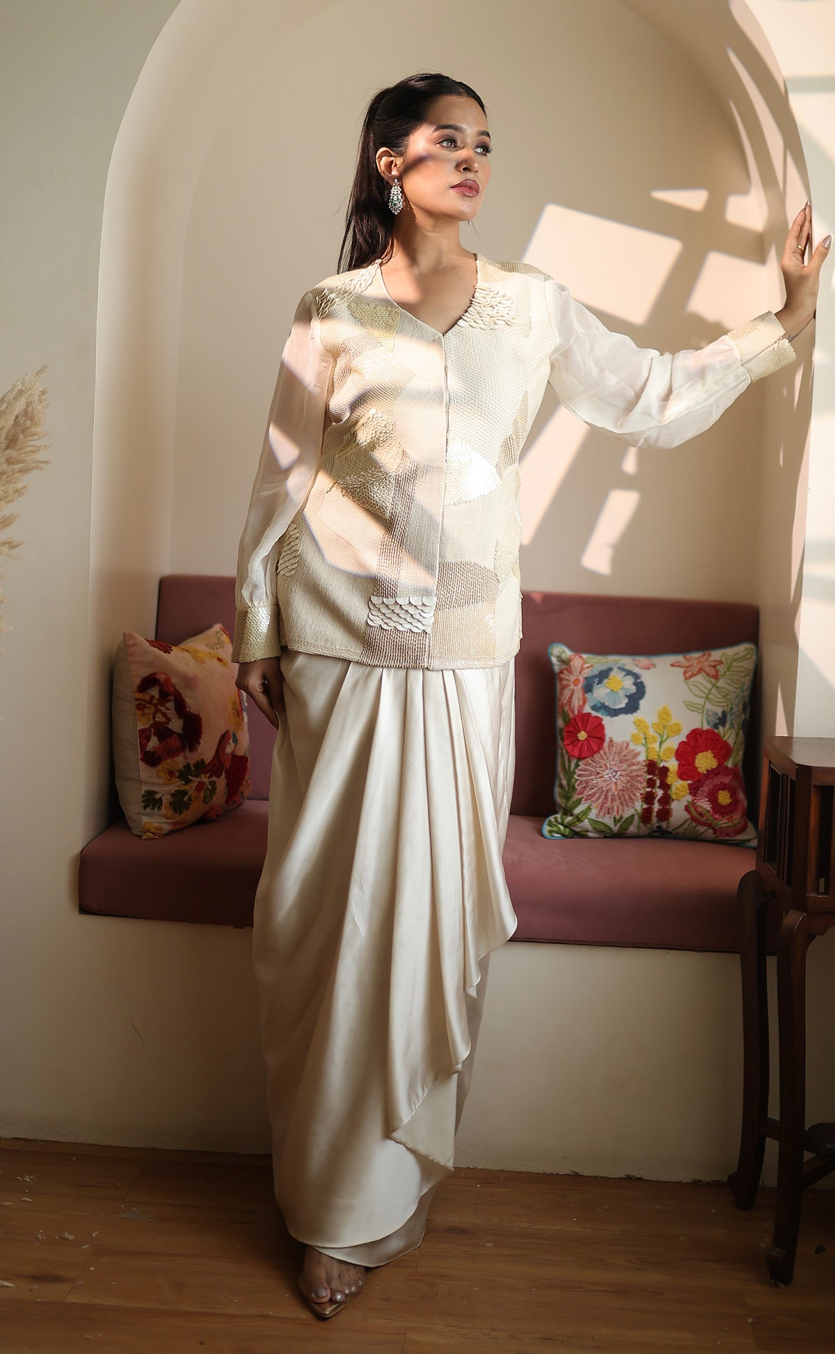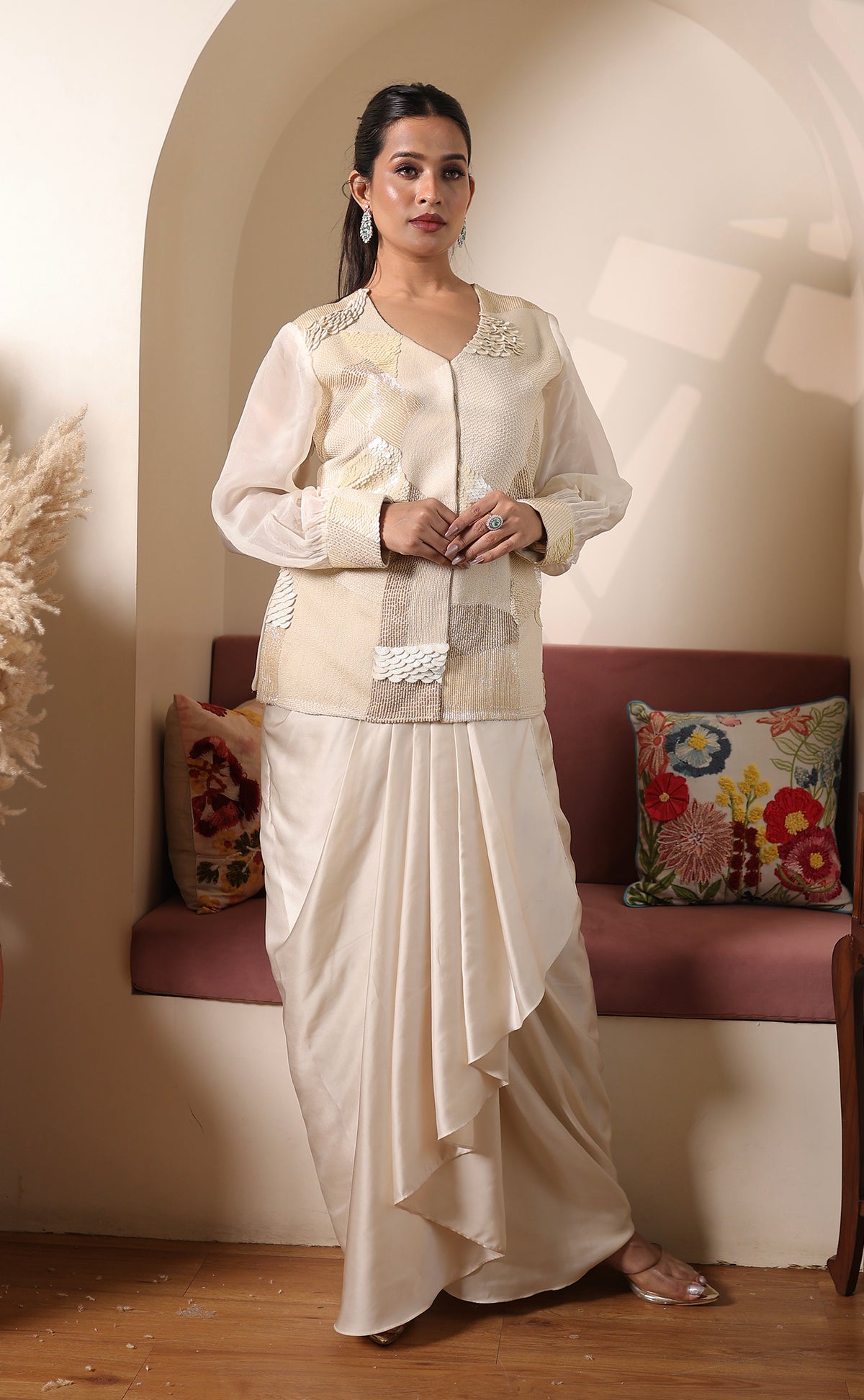 Effortlessly elegant and subtly bold, this ivory Indo-Western ensemble is a celebration of modern minimalism. Featuring a structured textured jacket with metallic detailing and sheer organza sleeves, it is paired with a fluid pre-draped skirt in luxurious Milano satin and banana crepe — offering comfort, structure, and statement all in one.